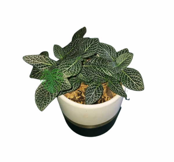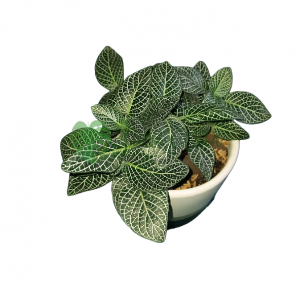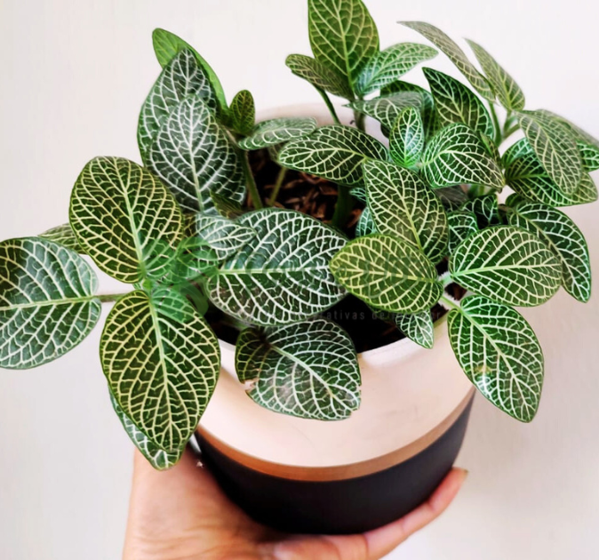 La Fittonia es una planta de interior originaria de América del Sur. Sus hojas son verdes y tienen venas o nervaduras de color que contrastan con el resto de la hoja.