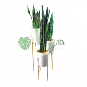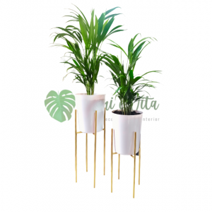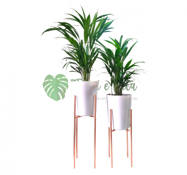 2 Plantas Palmera Areca + 2 bases para macetas de hierro tono bronce de 40 y 50 cm altura y 22 cm de diámetro.