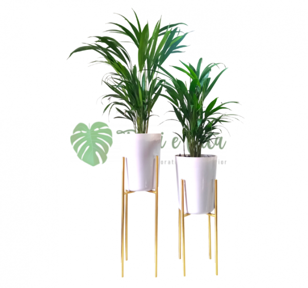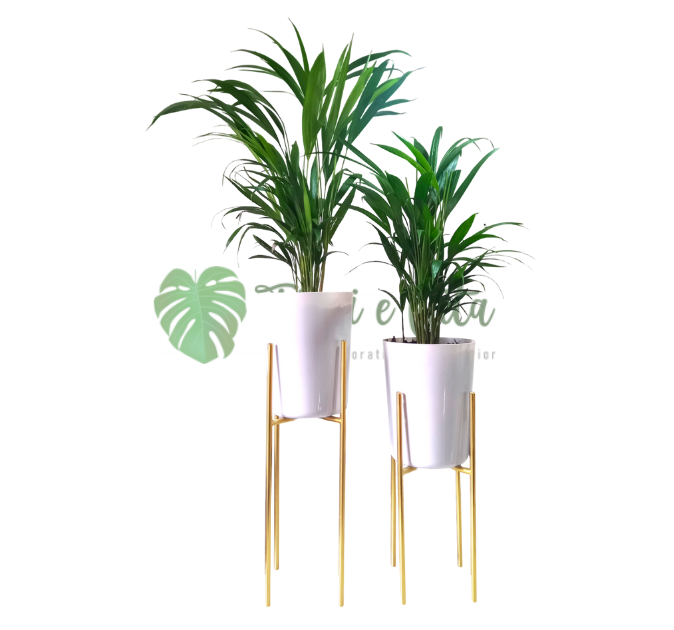 2 Plantas Palmera Areca + 2 bases para macetas de hierro tono dorado de 40 y 50 cm altura y 22 cm de diámetro.