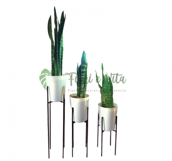Tres plantas Sansevieria Laurentii + 3 bases para maceta de hierro tono negro de 40, 50 y 70 cm de altura y 22 cm de diámetro.