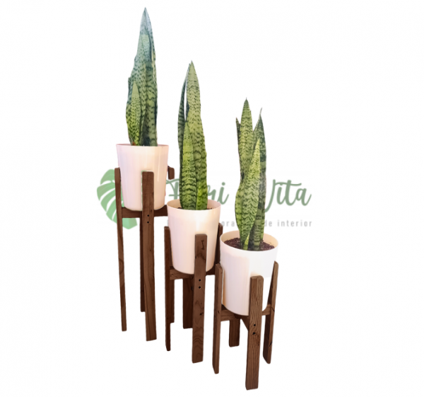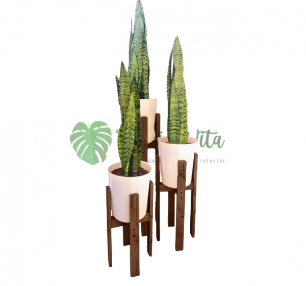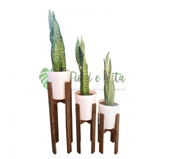 Tres plantas Sansevieria Laurentii + 3 bases para maceta de madera tinte y barniz café oscuro de 40, 50 y 70 cm de altura y 22 cm de diámetro.