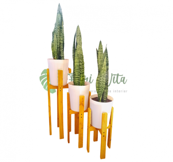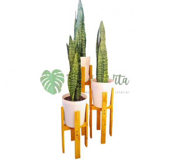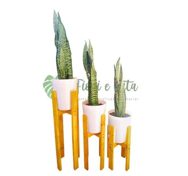 Tres plantas Sansevieria Laurentii + 3 bases para maceta de madera tinte y barniz roble claro de 40, 50 y 70 cm de altura y 22 cm de diámetro.
