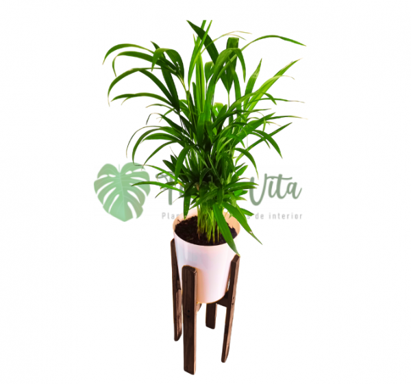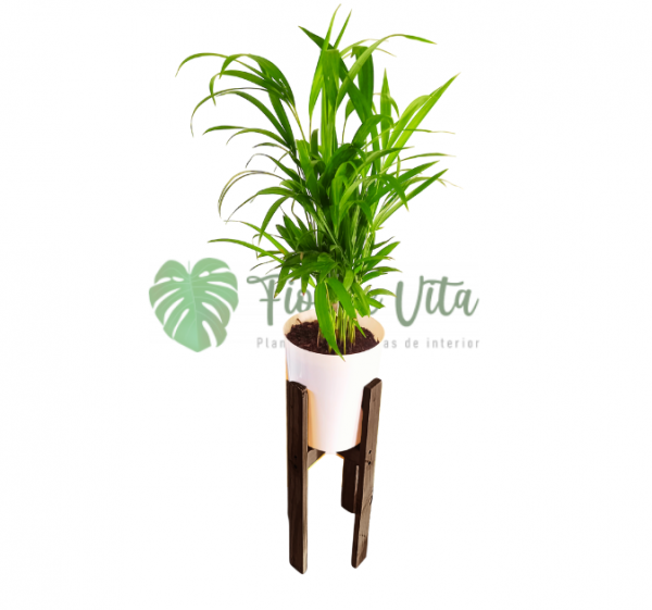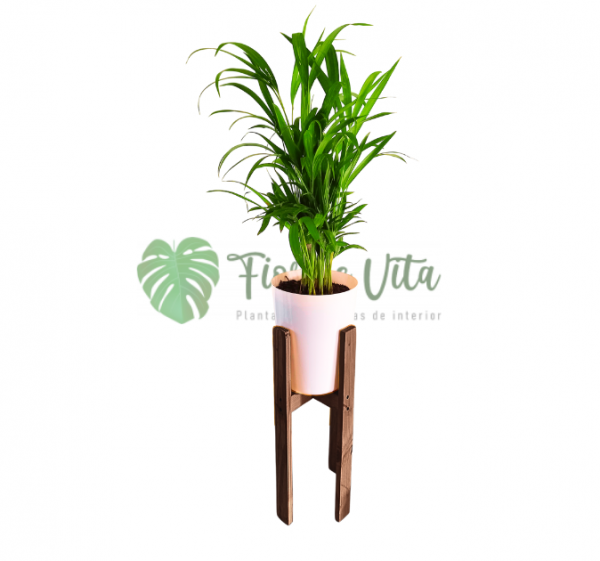 Planta Palmera Areca + base para maceta de madera tono café oscuro de 50 cm altura y 22 cm de diámetro.