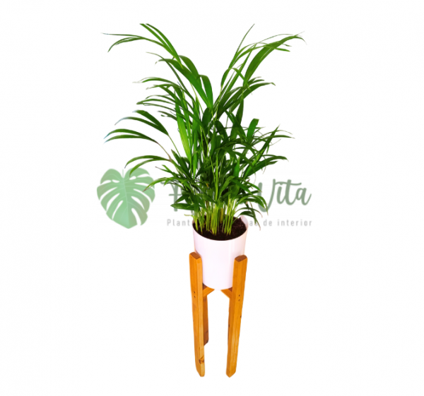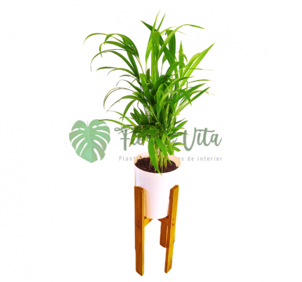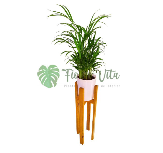 Planta Palmera Areca + base para maceta de madera tono roble claro de 70 cm altura y 22 cm de diámetro.