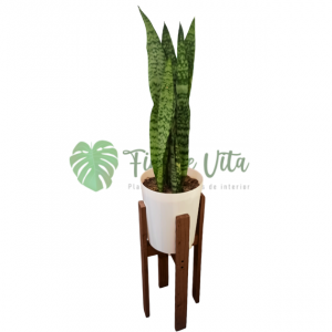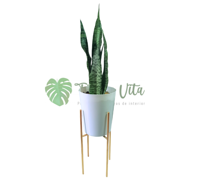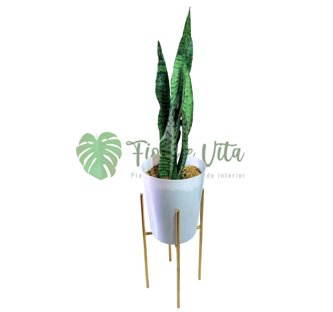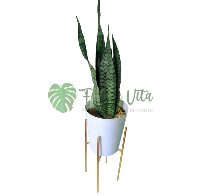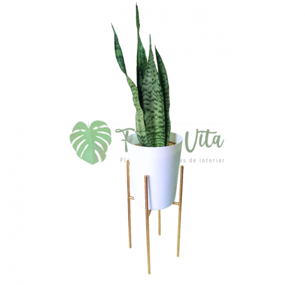 Planta Sansevieria Laurentii + base para maceta de hierro dorada de 40 cm altura y 22 cm de diámetro.