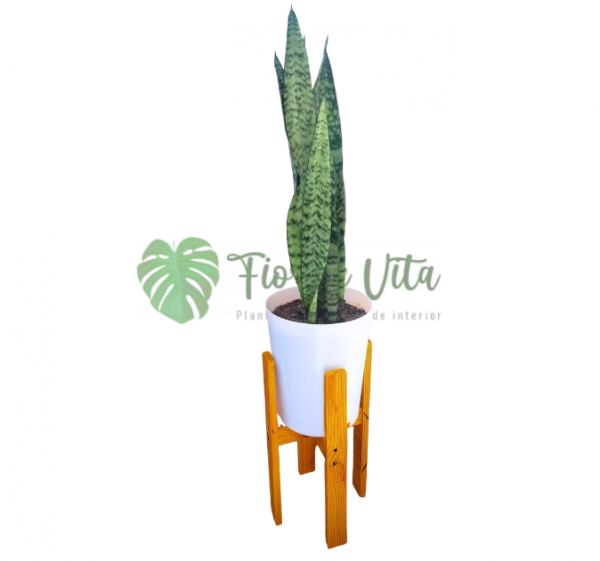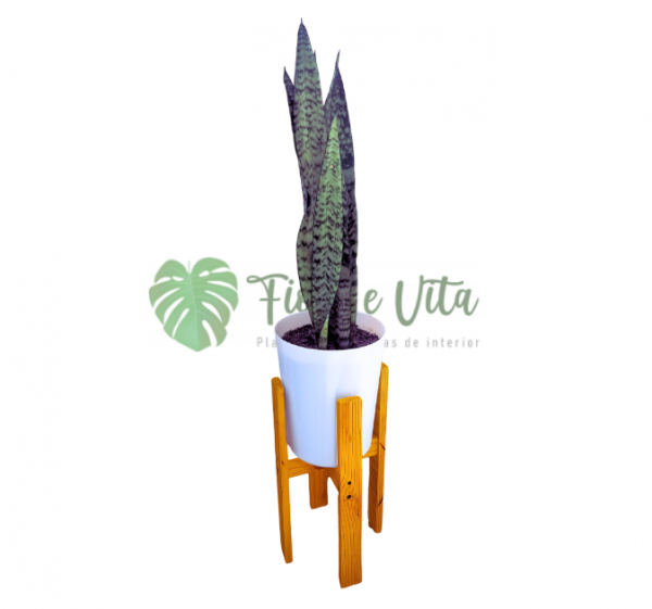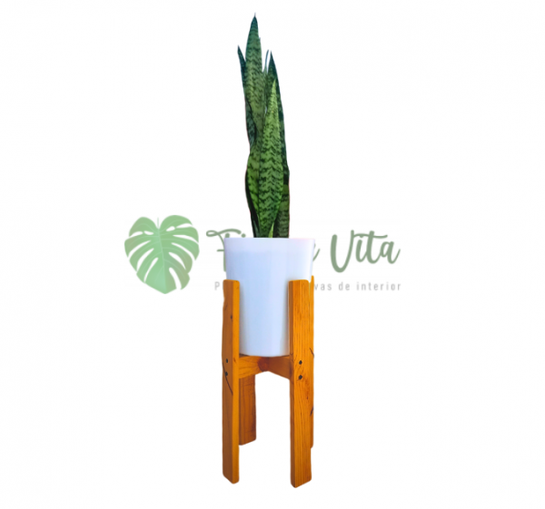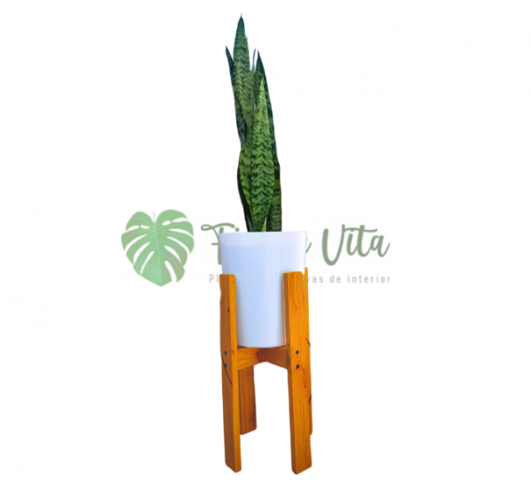 Planta Sansevieria Laurentii + base para maceta de madera Roble Claro de 40 cm altura y 22 cm de diámetro.