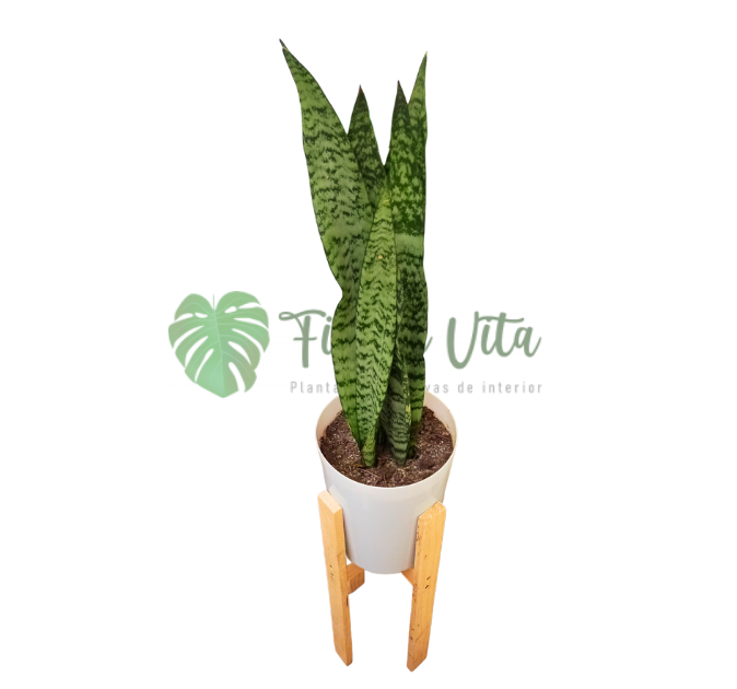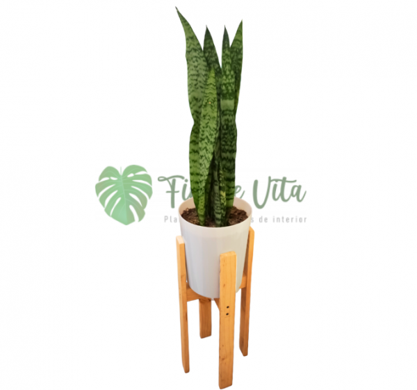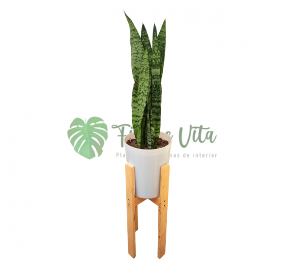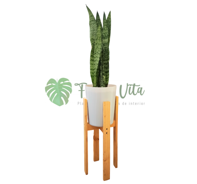 Planta Sansevieria Laurentii + base para maceta de madera tono natural de 50 cm altura y 22 cm de diámetro.